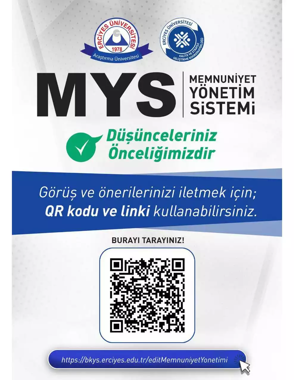 Üniversitemizde uygulanmakta olan Memnuniyet Yönetim Sistemi (MYS) aracılığı ile tüm paydaşlar (öğrenci ve idari/akademik personel) memnuniyet, öneri, talep ve görüşleriniiletilebilecektir.