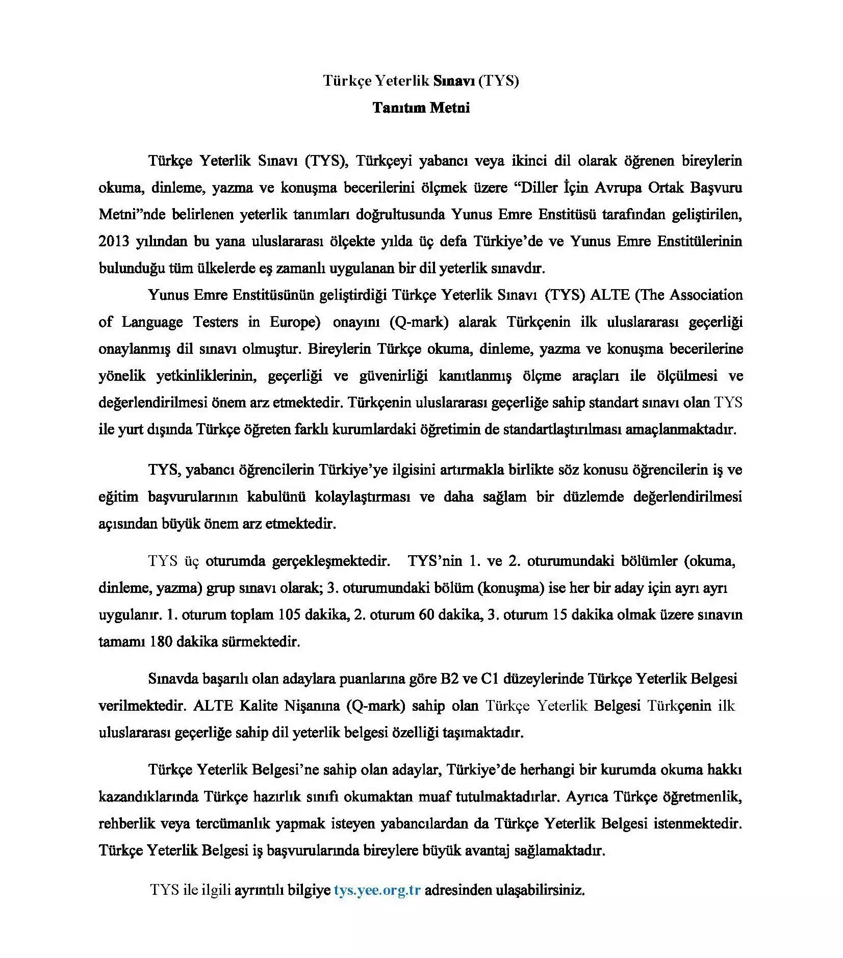 Türkçe Yeterlik Sınavı (TYS) Duyurusu